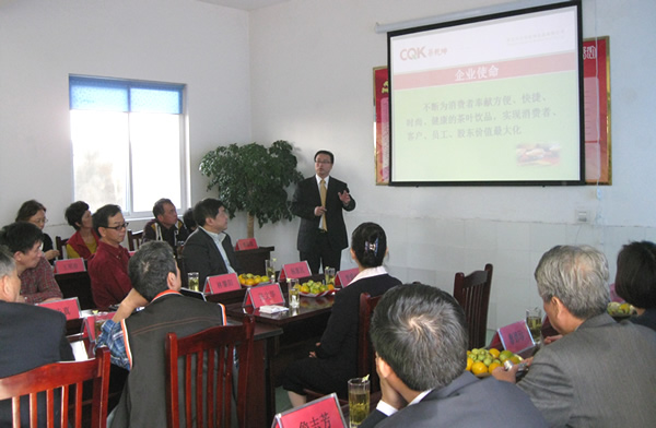 台湾制茶工业同业公会是台湾最大的茶业行业组织,有300余家企业为会员单位,这次是由理事长许正清先生带队应邀参加在杭州举行的2011国际茶业大会暨茶产品交易会。当他们得知中国最大的袋泡茶出口商之一我公司就在浙江时,立即推辞了大会安排的其他参观行程,专程赴茶乾坤进行行业交流和考察。