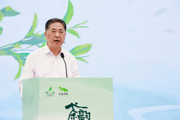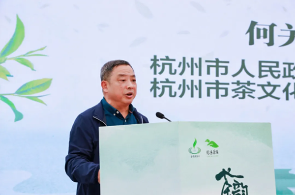 杭州市人民政府副市长宦金元发表讲话,他强调杭州以全民饮茶日活动践行“三茶统筹”发展理念,通过创新茶产品展示和茶文化体验,持续擦亮“中国茶都”金名片,推动茶文化传承与茶产业高质量发展。